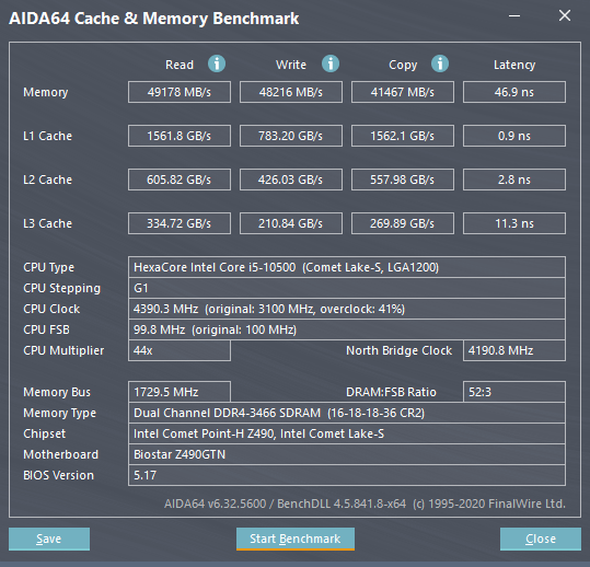 Nachdem wir feststellen mussten, dass wir das XMP-Profil für 3600 MHz der XPG SPECTRIX D50 RGB nicht auf unserem Biostar Z490GTN erfolgreich laden konnten, haben wir das Profil auf dem AMD-Board verwenden können. Mit dem Board erreichen wir eine Lesegeschwindigkeit von 54.127 MB/s und eine Schreibgeschwindigkeit von 52653 MB/s bei einer Latenzzeit von 72,5 ns.