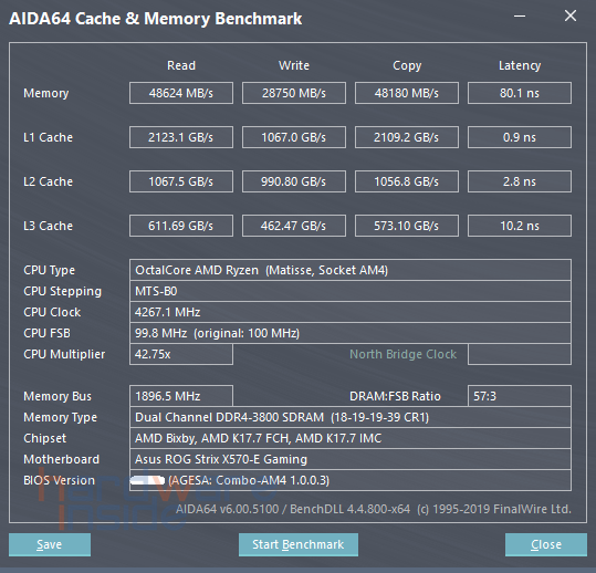 Im ersten Übertaktungsversuch, hierbei wird der Speicher bei einem Takt von 3.800 MHz betrieben. Mit dem Einstellungen erreichen wir 48.624 MB/s beim Lesen und 28.750 MB/s beim Schreiben – Kopiervorgänge werden mit 48.180 MB/s abgearbeitet. Die Latenz steigt dabei auf 80,1 Nanosekunden. Insgesamt eine leichte Verschlechterung zum XMP Profil.