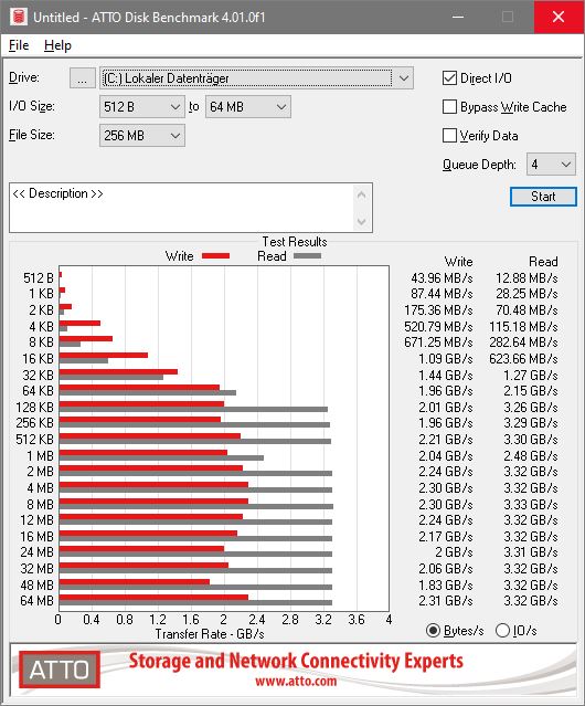 Im ATTO Disk Benchmark (Version 4.01.0f1) erzielte die Spectrix S40G beim Lesen bis zu 3330 MB/s und beim Schreiben 2310 MB/s. Dabei liegt die Schreibrate etwas unter der Angabe von XPG (3500 MB/s), aber die Leserate etwas über dieser (1900 MB/s). Damit verhält sich die Performance sowohl im ATTO als auch CrystalDiskMark Benchmark relativ identisch zur Leistungsangabe im Datasheet von XPG. In diesem werden die Werte für jede Kapazitätsvariante für ATTO, CrystalDiskMark, AS SSD sowie die IOPS und TBW angegeben.