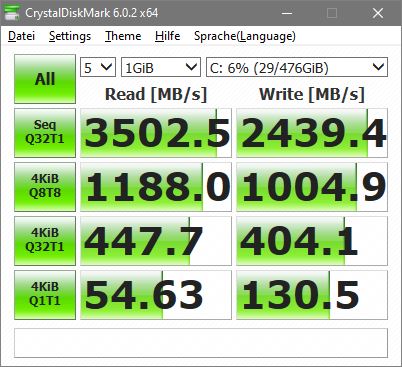 Um die Performance der XPG Spectrix S40G zu testen, haben wir CrystalDiskMark (Version 6.0.2) 5-mal durchlaufen lassen und daraus ein mittleres Ergebnis genommen. Bei der maximalen (sequenziellen) Lesegeschwindigkeit kommt die S40G sogar über den versprochenen Wert von 3500 MB/s – dafür bei der Schreibgeschwindigkeit nur auf knapp 2440 MB/s. Diese Werte entsprechen aber auch ziemlich genau den Geschwindigkeiten, die XPG selbst beim CrystalDiskMark Test im Datasheet für die 512 GB Variante ausschildert.