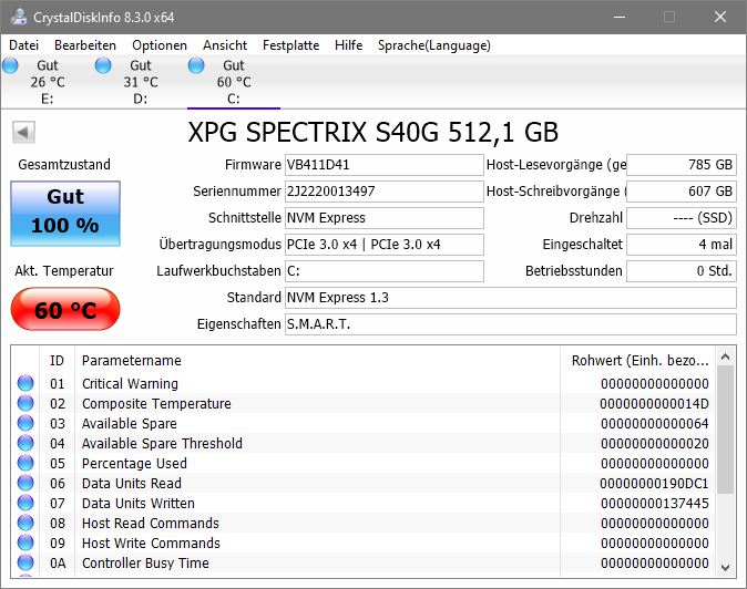 | SSD | 512 GB XPG Spectrix S40G RGB PCIe Gen3x4 M.2 (Firmware Version: VB411D41) |