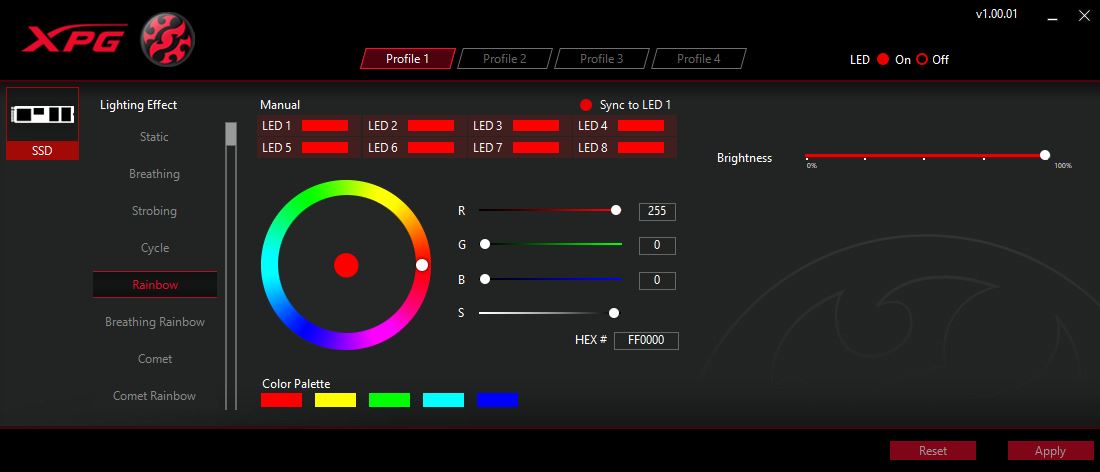 Über die Software von XPG lassen sich die Beleuchtungseffekte der NVMe SSD steuern. So stehen dem Nutzer 14 verschiedene Modi und vier Profile zur Verfügung. In den Profilen können die benutzerdefinierten Einstellungen abgespeichert und bei Bedarf gewechselt werden. Zusätzlich zu den Voreinstellungen können bei den Optionen wie z. B. Static oder Breathing die 8 LEDs einzeln belegt werden.