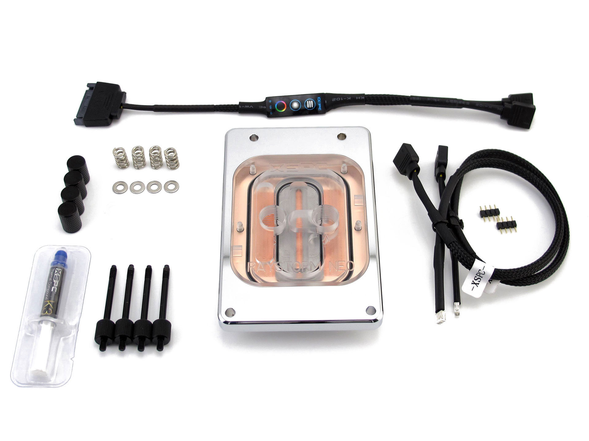 Der massive Threadripper benötigt einen großen Wasserkühlblock. So hat es sich XSPC nicht nehmen lassen ihren preisgekrönten Raystorm zu vergrößern. In der Neuauflage bietet der Raystorm NEO nicht nur eine größere Fläche, sondern auch eine LED-Steuerung, integriert im Y- Kabel, sowie zwei mitgelieferte LEDs. Der Acryl-Körper kann mit diesen LEDs in RGB Farben beleuchtet werden, während der Rahmen aus Aluminium, im edlen chrome oder schwarzen Look, dunkel bleibt. Die Kühlflüssigkeit kommt nicht mit dem Aluminium in Kontakt. Die Anschlüsse besitzen das gängige 1/4 Zoll und sind nahtlos in das Acryl eingelassen.