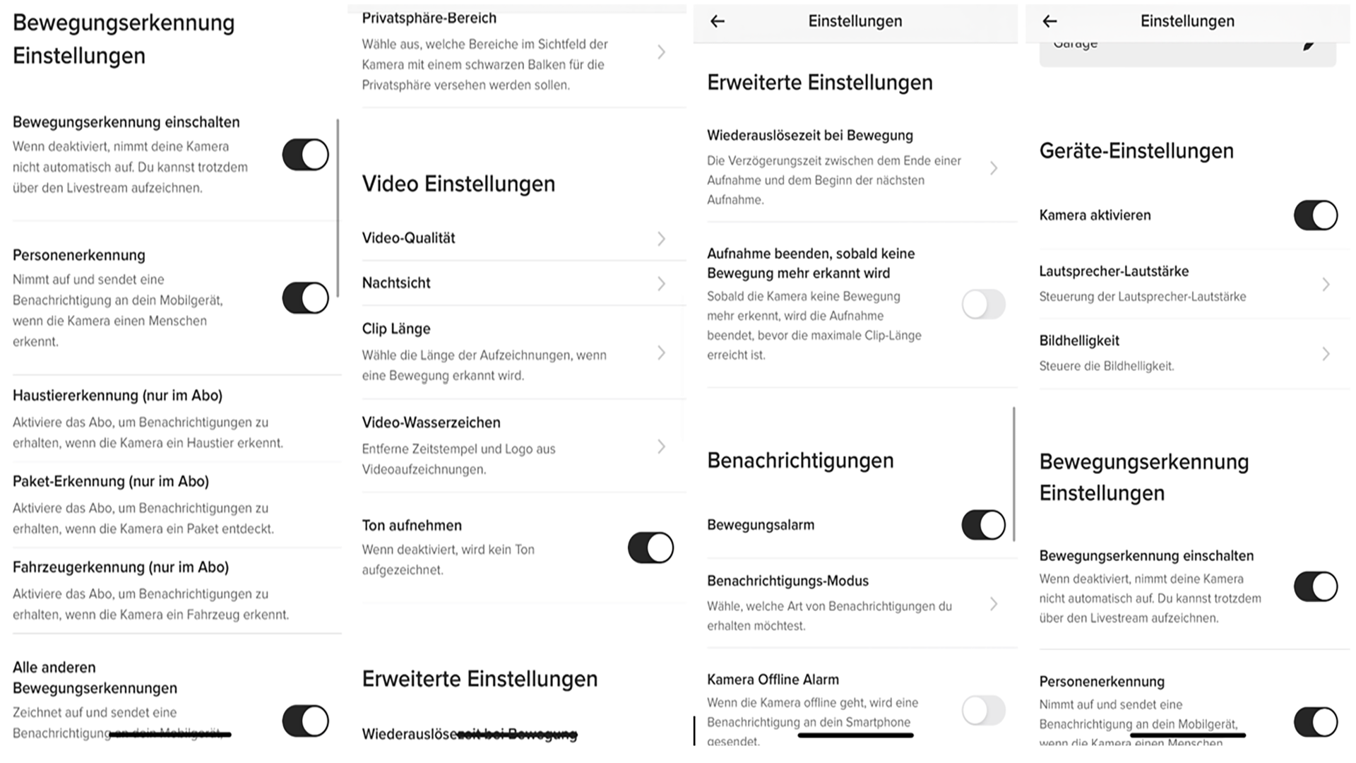 Für die Bewegungserkennung liefert uns die App viele weitere Einstellungsmöglichkeiten. So können wir hier den Bewegungsmelder an- und ausschalten, die Personenerkennung aktivieren und im Submenü sogar die Haustier-, Paket- und Fahrzeugerkennung betätigen. Auch die Empfindlichkeit des Bewegungsmelders lässt sich hier einstellen.