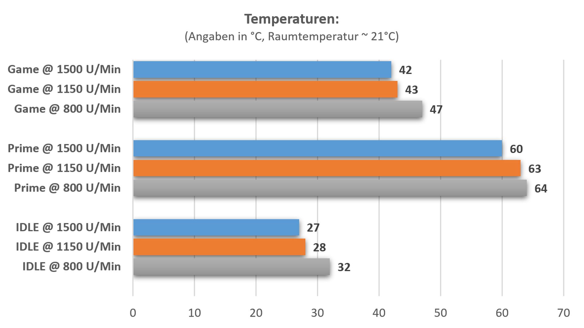 Wir testen den Zalman CNPS20X im IDLE Betrieb, im Spiel Escape from Tarkov und unter Prime95 29.8b5 für die maximale Temperatur. Der Intel Core i7 7700k ist auf 4,5 GHz übertaktet und es liegt eine Spannung von 1,270 Vcore an. Die Kühlleistungen werden bei 800, 1150 und 1500U/Min der Lüfter ermittelt. Die erreichten Werte sind wirklich gut und können ohne weiteres mit einer 360mm AiO mithalten. Es gab während der verschiedenen Durchläufe nie Temperaturprobleme. Bei 800 bis 1200 U/Min arbeiten die Lüfter leise und zuverlässig. Erst darüber bis zur maximalen Drehzahl von 1500 U/Min sind die Lüfter deutlich zu hören.